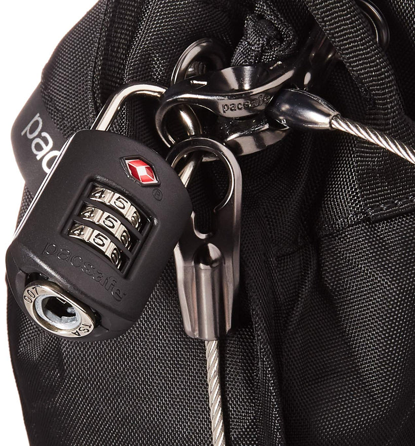 - Maximum security - 360 Degree stainless steel Wire mesh embedded in poly canvas fabric is highly cut resistant. Design patented in the USA, by Pacsafe, the original anti-theft brand. Can be locked securely with TSA accepted 3-dial combination lock (inch.).
