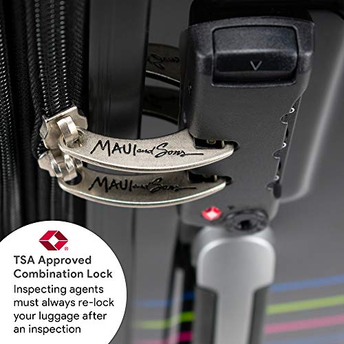 Details: Maui and Sons:In 1980, three young surfers from Southern California were trying to decide what to do with the rest of their lives. They decided to start a cookie company named Maui's Chocolate Chip Cookies, but their little business venture didn't last long. When they burnt their first batch of cookies, they turned their attention to designing fashions for surfing and active sports.Maui and Sons became an instant hit! And the cookie? It became an inspiration for the Maui and Sons logo. Inside, you will see elements representing the earth, sea, sky and fire. It's a celebration of the power of nature and a tribute to the amazing creativity in everything from Maui and Sons.The Stripes Luggage Set: The luggage set is made of PC and ABS that are both light and durable Features a smooth and shiny finish for a true surfer style that you'll definitely fall in love with. Equipped with ultra-smooth 360° rotating double wheels, that allows it to handle heavy weights. Comes with a TSA approved combination lock for your peace of mind while traveling. A zipper divider for easy organizing. The luggage is also 25% expandable for more packing capacity.Environmentally Friendly Packaging:The packaging materials used are made from recycled paper and printed with environmentally friendly ink. Designed in the USA, Made in China.Prop 65 disclaimer for California residents: PC contains BPA, which is known to cause cancer and/or reproductive harm.