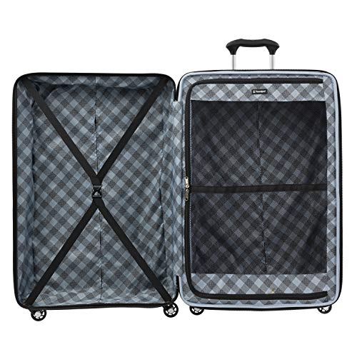 Details: Go big, stay light, and check it without worry! the Maxlite 5 29" expandable hardside spinner gives you maximum packing space in a large, ultra-durable checked bag conveniently designed with a 2" expansion option. Despite its lightweight construction, this bag is built tough with a flexible polycarbonate shell that protects contents while resisting cracking or splitting, a textured surface to help reduce visible scratching or scuff marks and molded corner guards that serve as built-in bumpers on high-wear points.Integrated lock allows TSA authorities to safely unlock and lock suitcase for inspection when needed (default lock code is 0-0-0 to open). Great for longer trips or multiple people, this bag's split case construction and interior divider panel provide separate packing compartments, and elastic hold-down straps keep everything in its place. Even at this size, mobility is easy on four 360 degree spinner wheels guided by the lightweight, height-adjustable PowerScope lite handle with comfortable Contour grip. Backed by Travelpro built for a lifetime limited warranty with our trusted companion promise which covers the cost of repair for damage from airline or other common carrier for 1 year.