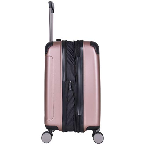 Details: Expands for greater carrying capacity. 8-Wheel Spinners allow smooth 360-degree rotation. Lightweight Construction. Durable hard side exterior and molded corner guard reinforcement for maximum impact resistance and Fully lined interior. Lid section features a large u-shaped zippered pocket which includes A mesh zipper pocket and elastic shoe pockets. Main compartment includes a full-length zipper pocket, garment restraint panel with snap locks, and a large mesh zipper pocket. Durable molded bottom grab handle and flexible top and side handles allow for easy lifting. Locking retractable trolley handle. Overall Dimensions: 22"h x 15.35" W x 9-11" D; Weight: 7.2 lbs. Includes a 10-year Limited manufacture warranty.