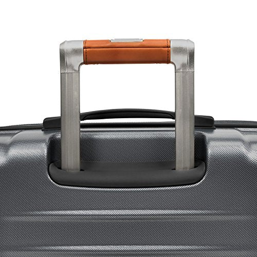 - The 25-inch has 100% virgin polycarbonate outer shell made from Makrolon by Covestro offers lasting durability; protective corner guards at high stress points protect against impact. The internal frame assembly delivers resilient structure at a light weight. Contrasting leather-look accents add rich detail. Multi-stage retractable handle with ergonomic grip promotes maneuverability.
