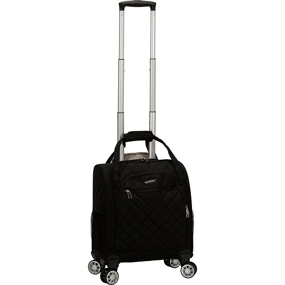 Details: Carry all your essentials in style and comfort with the Rockland Wheeled Underseat Carry on Bag. Quilted polyester fabric exterior features a large main compartment for clothes, shoes and also has 2 slip pockets and two zippered pockets for keeping small essentials handy and organized. Retractable handle stores away while hand held handles allow for quickly grabbing bag from overhead bin or underneath seat. Back side has a strap allowing you to attach it to your wheeled carry on piece. This makes the perfect bag fro overnight trips and the small size fits undernear most airline seats allowing you to carry on your bag even when overhead bins are full. Measures 15"H x 14"w x 9"L without wheels, 17"H with wheels (interior dimension 8"x13"x8").