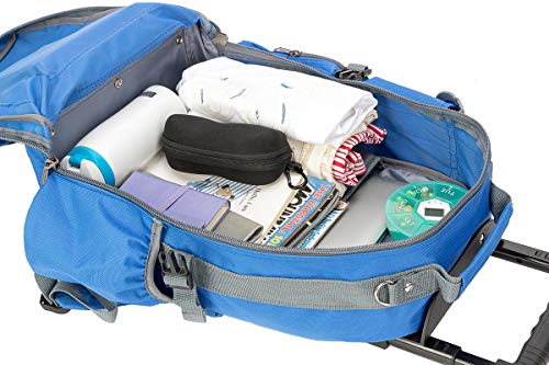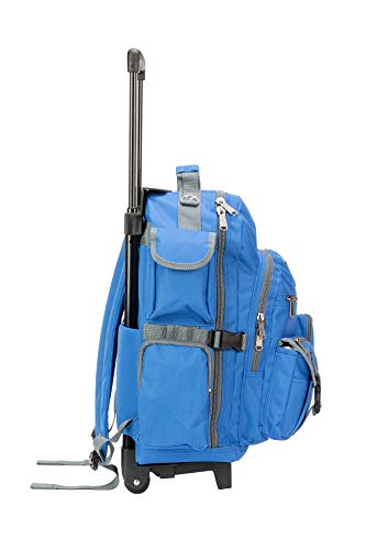 Total of 10 external pockets for keeping everything well organized. Sturdy padded fabric handle with metal D ring on each side for extra attachments 39" Handle length from ground to top. Adjustable padded shoulder straps with place to Store them while rolling Quick release compression strap on both sides of Backpack. Zipper front pocket with front mesh pocket attached. High Quality deluxe rolling backpacking comes with front expandable pockets with buckle and small zipper pocket on Pocket flap.