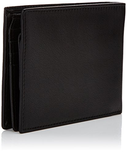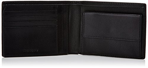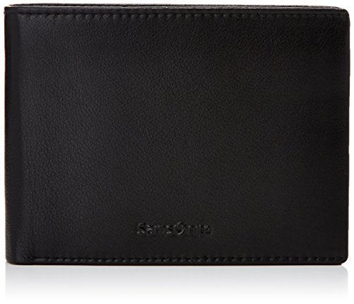 Details: trifold wallet, leather, label SAMSONITE, solid black, embossed logo, horizontal, 5x3¾x1¼in (13x9.5x3cm), comes in carton box. 2 bill compartments, 1 coin compartment with snap closure, 7 credit card pockets, 7 drivers licence pockets, 1 of which transparent