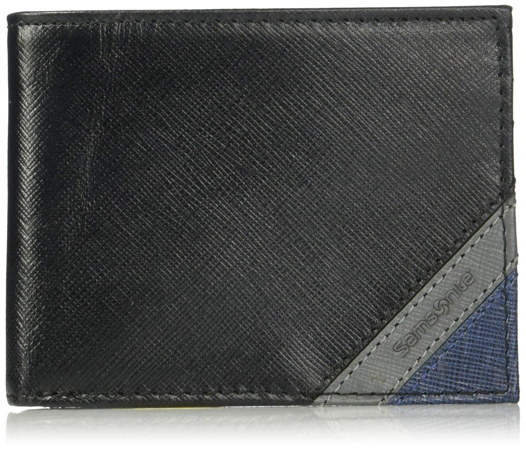 Details: Full grain saffiano leather with contrast color accents, Samsonite branded lining, nickel hardware, debussed Samsonite signature logo and rfid blocking material shaded bi-fold with zip pocket features 5 credit card slots, 2 utility pockets, 1 zipper coin pocket and a lined currency pocket.