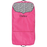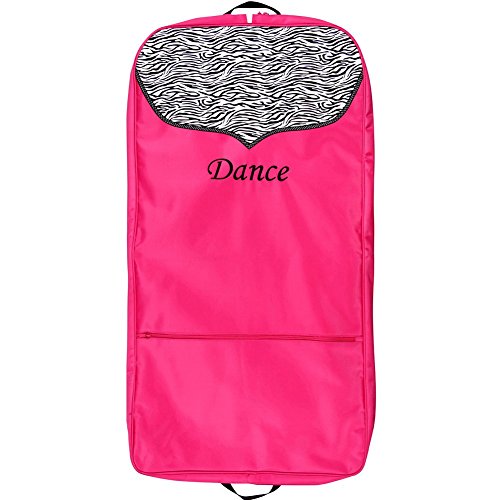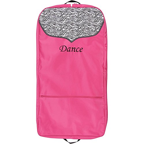 Details: Pink Zebra garment bag a trendy and useful accessory from Sassi Designs. Screen printed zebra pattern with embroidered "Dance" and polka dot grosgrain ribbon trim. Full width front zipper pocket. Fully lined with top opening for hangers. Can be personalized. Matching personal I.D.tag. Sizes" 42'x 21"x 2.5".