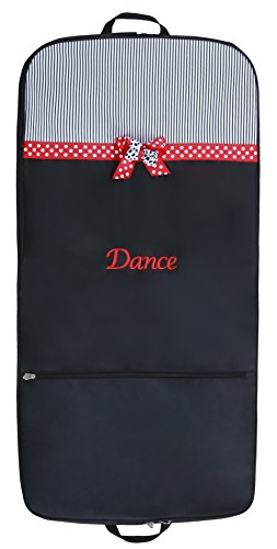 Details: This Mindy Garment Bag will sure please any dancer. Adorable screen print with red and black colors stands out above the rest. Easy access with side zipper to insert your garments and full width front zipper pocket. Two inside pockets will help store your belongings. Beautifully embroidered with "Dance". Wipe clean with a damp cloth on this durable microfiber material.