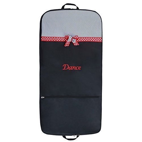 Details: Garment bag from Sassi Designs with elegant features and details for those who practice dance. Mindy garment bag with "Dance" embroidery, grosgrain ribbon trim and bow, striped screen print. Full width front zipper pocket, two inside pockets and top opening for hangers. Measures: 42"H x 21"W x 2.5" Gusset.