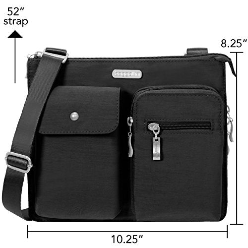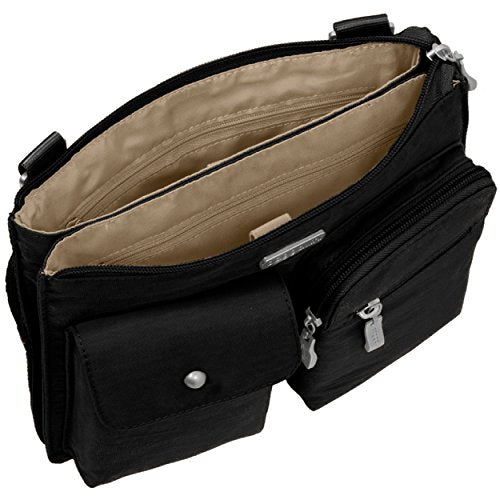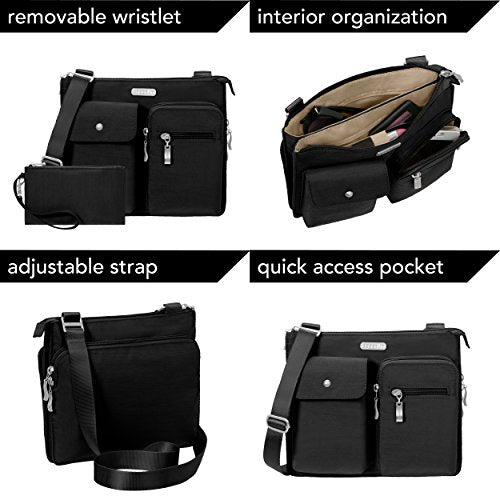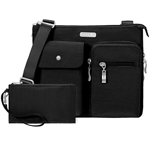 - Cross-body bag in lightweight, water-resistant nylon featuring removable coin purse, mismatched front compartments, and zippered middle wallet pocket with credit card slots