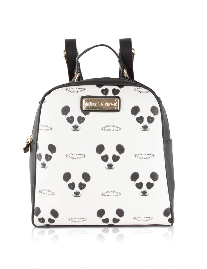 Details: Stand out in style with this bold and fun Betsey Johnson Medium Backpack, Featuring Fun Betsey logo and Panda face printed exterior, Signature logo plaque, zip back pocket, top carrying handle with 2 drop, adjustable shoulder straps 15-21 drop, Zip closure opens to fully lined interior with zip and 2 media pocket great for organization. Up your accessories game with this eye catching backpack!