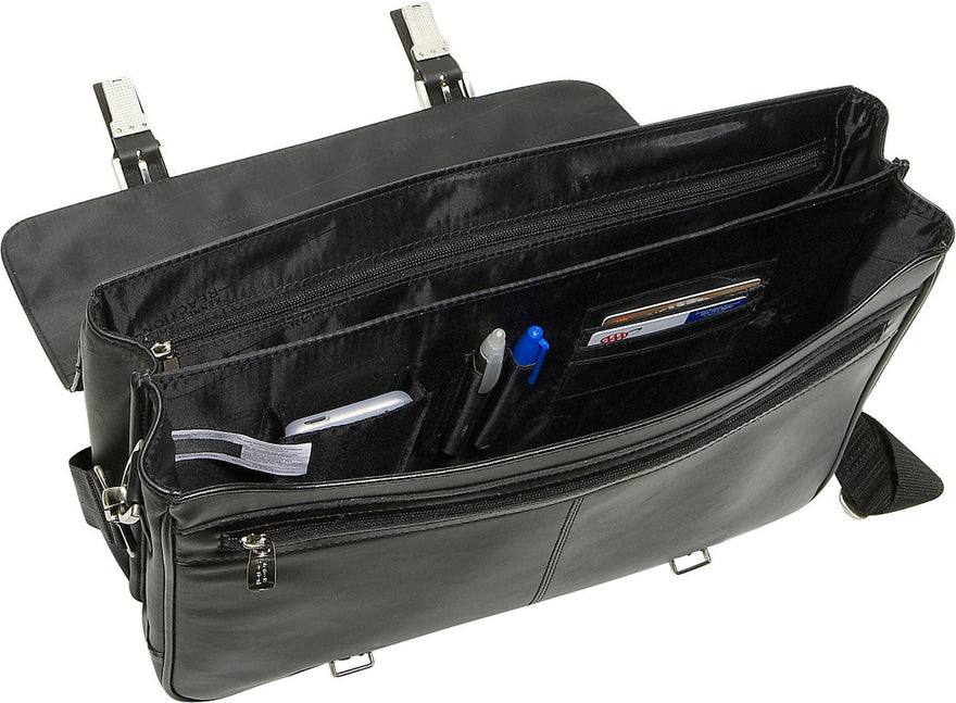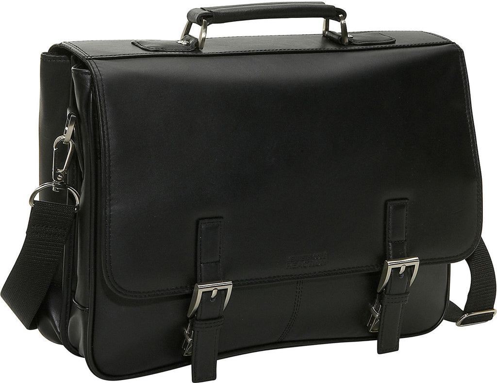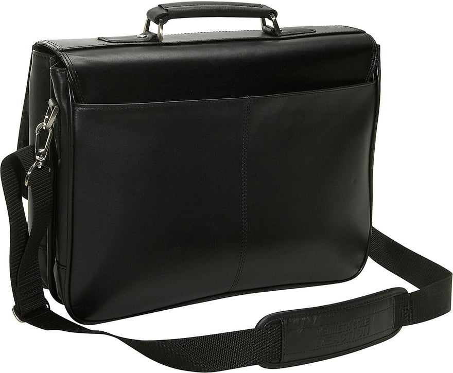 Keep your laptop computer well protected and your business essentials well organized in the Kenneth Cole Reaction A Brief History Leather Flapover Portfolio. This handsome and luxurious but affordable top grain nappa leather bag features secure and stylish double gusset flapover construction and boasts two main compartments: one for your laptop computer, with a full-length zippered pocket for loose papers; the other a gusseted compartment with an internal organizer that contains a cell phone pocket, card slots, pen/pencil holders, and a full length zippered pocket. An additional zippered pocket under the front flap provides extra storage space, and an easy-access rear exterior open pocket is perfect for stowing files. The Kenneth Cole Reaction A Brief History Leather Flapover Portfolio has a removable, adjustable shoulder strap and a sturdy top handle for carrying versatility.