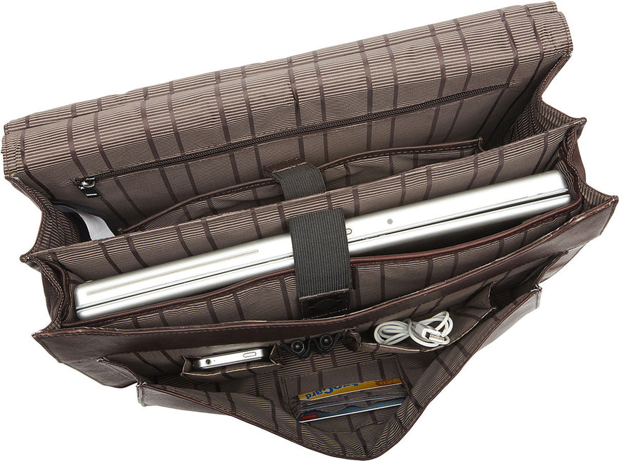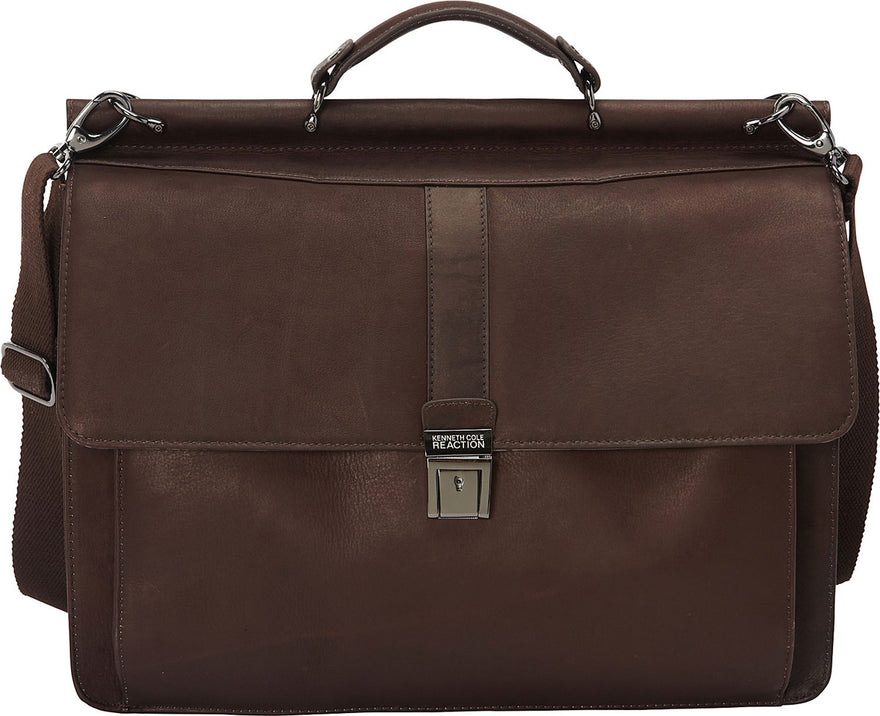 This vintage inspired portfolio adds a touch of sophistication to any modern professional's morning commute. The Kenneth Cole Reaction "Rod Light, Green Light" Double Gusset Dowel Rod Portfolio is crafted from full grain Colombian leather and features a dowel top design with double gusset flapover construction, a top grab handle, and an adjustable, detachable shoulder strap that makes it comfortable to carry. This portfolio has a divided interior that includes a padded laptop pocket, a protective tablet pocket, a file pocket, a rear zipper pocket, and an organizer section with pen sleeves, card pockets, and slip pockets to hold small accessories.