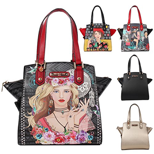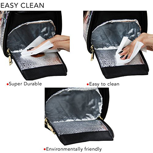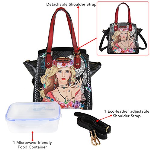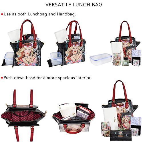 Details: Carry your lunch in the most stylish way with the stunning Nicole Lee Adeen Samart Lunch Handbag. Exterior Features: Exclusive Nicole Lee Print at front and back made of vegan leather, metal zipper closure with NL monogrammed zipper pull, dual top handles, NL authentic medallion on front handle, detachable shoulder strap, bottom side zip compartment, structured silhouette and NL nameplate at front. Interior Features: Large open compartment perfect for storing utensils and condiments with zip wall pocket with NL nameplate at back, vegan leather key chain strap, wall pocket at front, this bag features an insulated bottom compartment to keep your lunch hot or cold, includes a food container that fits perfectly in the bottom compartment. Vegan leather handles with 6.5" inch drop. Includes adjustable 44" - 53" inch shoulder strap. Colors available are Clara Loves Photo, Bike Tour, Elsa's Dream Catcher, Black, Gold. For cleaning, wipe with damp cloth.