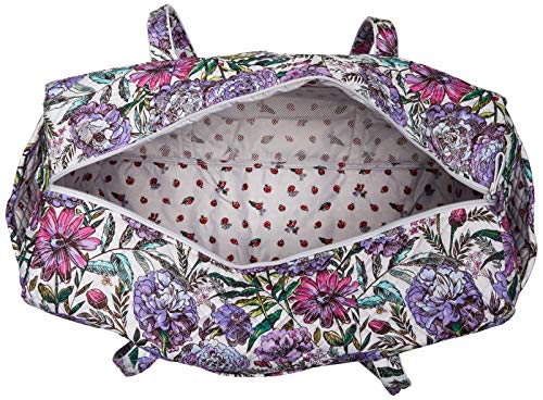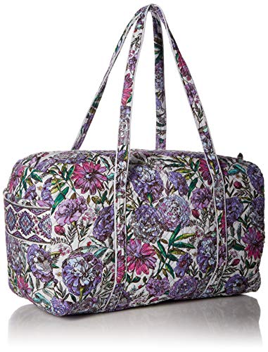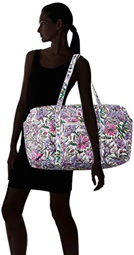 Details: Vera Bradley has crafted the perfect size, carryon compliant duffel to fit everything you need for your next adventure. The iconic large travel duffel is the fashionable solution for storing your travel essentials, packing efficiently, and avoiding checked bag fees - measuring 11.5 inches high, 22 inches wide, and 11.5 inches in diameter. The interior of this spacious duffel features one zip pocket and three elastic mesh pockets. Skip the extra carry on and take advantage of these pockets to organize your cosmetics, hair products, jewelry and other toiletries. The exterior features one zip pocket and three slip pockets that are perfect for stowing your travel essentials - wallet, phone, boarding passes, reading material, and snacks. Keep your most important items at your fingertips with pockets positioned for quick access and soundly fastened for your flight. The iconic large travel duffel keeps you hands-free so there is plenty of room for adventure. With a 15 inch strap drop, you can grab the dual straps on the go or throw over your shoulder for hands-free attention - either way, the top zip closure keeps your personal items securely protected. Whether it's a weekend getaway or a girl's trip, Vera Bradley has designed this necessity for every traveler. Crafted with our lightweight signature cotton, you can use the duffel to upgrade your organization or fold flat to pack as an extra travel bag. When quality material meets precise craftsmanship, you get a bag made to last through all of life's journeys. Care: machine wash cold, gentle cycle, use only non-chlorine bleach as needed; line dry.