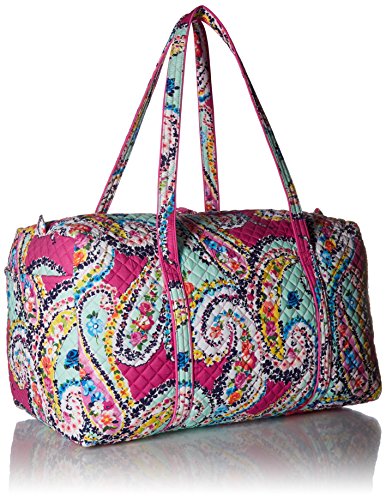 Details: Vera Bradley has crafted the perfect size, carryon compliant duffel to fit everything you need for your next adventure. The Iconic Large Travel Duffel is the fashionable solution for storing your travel essentials, packing efficiently, and avoiding checked bag fees - measuring 11.5 inches high, 22 inches wide, and 11.5 inches in diameter. The interior of this spacious duffel features one zip pocket and three elastic mesh pockets. Skip the extra carry on and take advantage of these pockets to organize your cosmetics, hair products, jewelry and other toiletries. The exterior features one zip pocket, a charger pocket, and three slip pockets that are perfect for stowing your travel essentials – wallet, phone, boarding passes, reading material, and snacks. Keep your most important items at your fingertips with pockets positioned for quick access and soundly fastened for your flight. The Iconic Large Travel Duffel keeps you hands-free so there is plenty of room for adventure. With a 15 inch strap drop, you can grab the dual straps on the go or throw over your shoulder for hands-free attention - either way, the top zip closure keeps your personal items securely protected. Whether it’s a weekend getaway or a girl’s trip, Vera Bradley has designed this necessity for every traveler. Crafted with our lightweight signature cotton, you can use the duffel to upgrade your organization or fold flat to pack as an extra travel bag. When quality material meets precise craftsmanship, you get a bag made to last through all of life’s journeys. Care: Machine wash cold, gentle cycle, use only non-chlorine bleach as needed; line dry