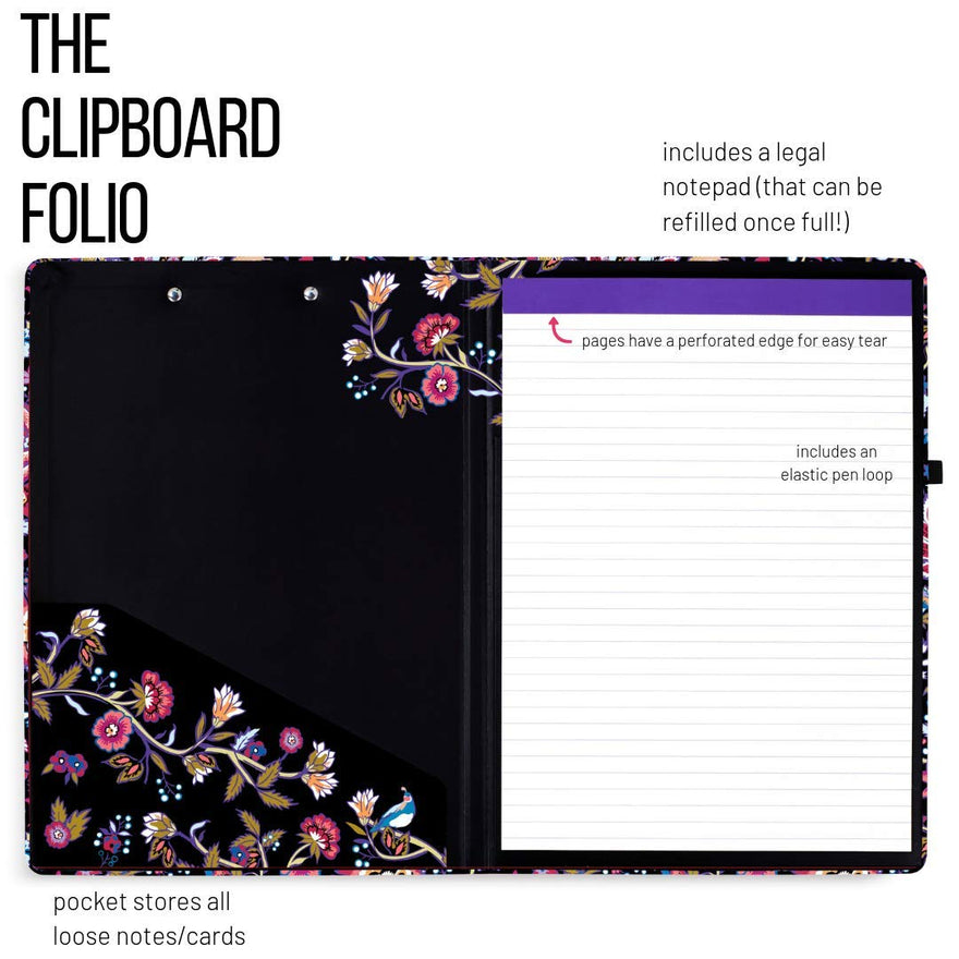 - This folio clipboard includes a legal notepad (that can be replaced once full!) and a loop to secure your ink pen