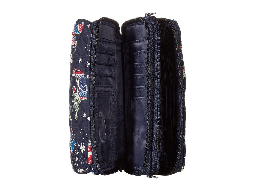 Details: Beauty and ingenuity are crafted into every Vera Bradley® piece, adding brightness, fun, and functionality wherever you go. The Vera Bradley® Iconic RFID All-In-One Crossbody handbag offers a range of organization options. Use it as a crossbody, a wristlet clutch, or a wallet! RFID protection guards against identity theft when bag is closed. Made of quilted microfiber fabric. Dual zip-around closures with magnetic flap closure. Removable crossbody strap. Detachable wristlet strap. Exterior features a convenient cell phone pocket. Interior features eight card slips, six slip pockets, one currency pocket, one zip pocket, and a clear ID window. Fully lined. Imported. Measurements: Bottom Width: 6 1⁄2 in Depth: 1 in Height: 3 3⁄4 in Strap Length: 45 in Strap Drop: 22 in Handle Length: 10 in Handle Drop: 5 in Weight: 8.25 oz