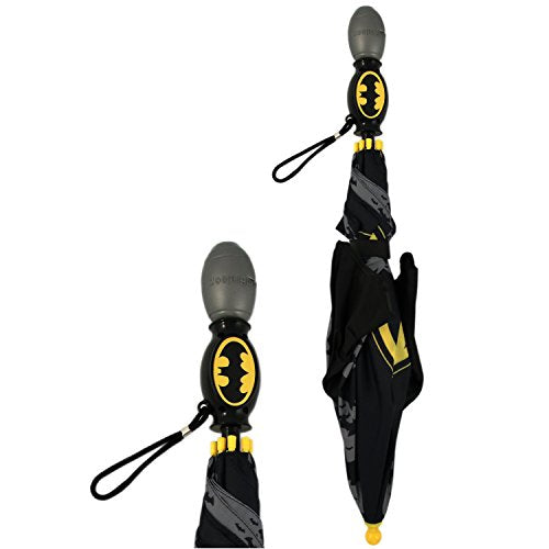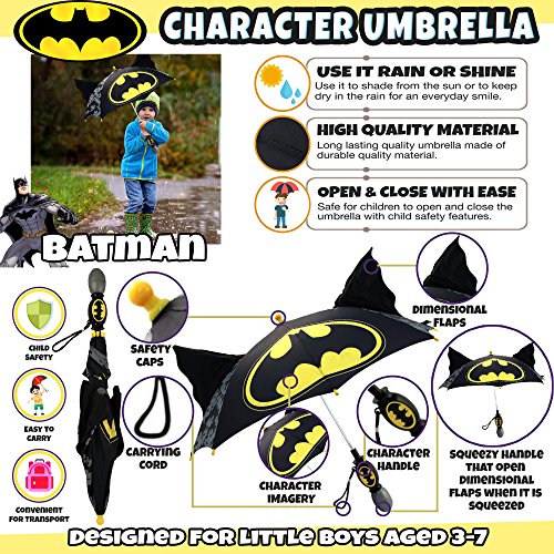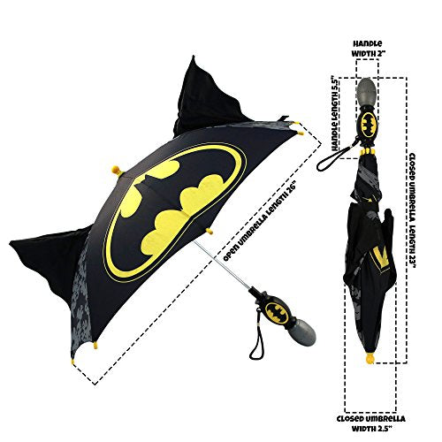 • Enjoyable design: black 8-section umbrella featuring colorful batman character imagery from DC Comics. Dimensional ears: squeeze the handle and watch batman dimensional ears start flapping! Fun way for kids to use an umbrella.