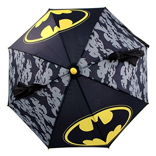 Details: Bring on the rain -- a dark day is no match for the dark knight! Your little caped crusader can fight puddles as well as crime in this cool batman designed umbrella. The stylish character umbrella features colorful imagery of the popular hero batman from warner bros DC Comics. Squeeze handle to flap wings in this fun design. Designed for little boys aged 3-7, the black 8-panel umbrella features yellow batman logos and has yellow protective caps on all points. The decorated character handle features a stylish batman design and has a convenient black nylon carrying cord. A velcro closure strap lets children easily fasten the umbrella for comfortable carrying. Whether he's running through the streets of Gotham city or running through puddles on the playground, this DC Comics batman umbrella is sure to make a splash.