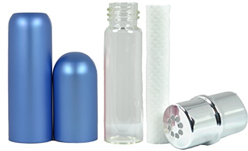 Details: Use your essential oils anytime and anywhere with this personal inhaler! Inhale your aromatherapy oils anywhere by saturating the cotton wick with your choice of essential oils. The upscale aluminum & glass design is refillable by re-saturating the cotton wick or you can replace the cotton wick with a new one and refill with a completely new oil blend. We designed the glass bottle's cap in such a way that it doesn't use glue to fit in metal cap so no worries about glue leaking and leaves debris on glass valve. Enjoy the therapeutic benefits of essential oils personally without diffusing into the air of the entire room. Keep one in your office desk, your pocket, your purse, your backpack or anywhere for quick and easy inhaling. Size of the inhaler is 3.5 inches x .75 inches. Each inhaler comes with one cotton wick. Inner glass bottle is easily removed by simply unscrewing it. The way to use the inhaler follows: When you are using the personal inhaler to just help you deal with various emotional issues you simply place the inhaler tip just about a half an inch below your nostril. You do not ever need to place the nasal inhaler inside the nostrils. In fact, we suggest you never insert them in your nose. The proper way is to hold the inhaler just below your nose and slowly inhale. Slowly is the key. Count slowly 1, 2, 3, 4, 5. as you inhale. Then hold for another count of 5, and then slowly exhale. What this does is help your body to absorb and utilize the essential oil. It gives the essential oil molecules a chance to be absorbed into your bloodstream. Once they are there, they can be delivered throughout the body and to the brain as needed. Repeat the above procedure - 2 to 3 times for each nostril and then you are done. You can use your nasal inhaler every 2-3 hours if needed.