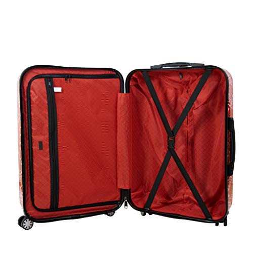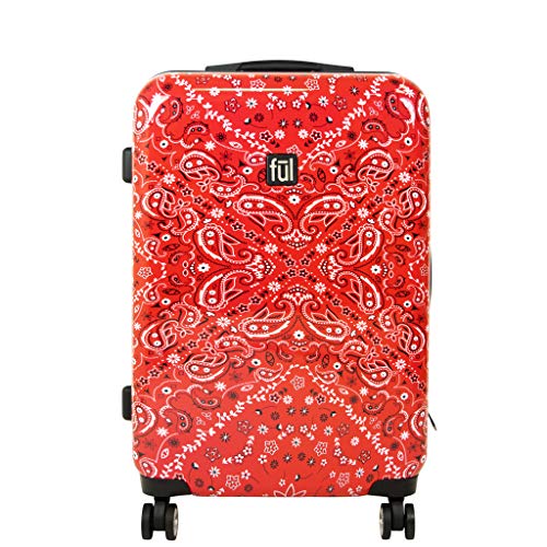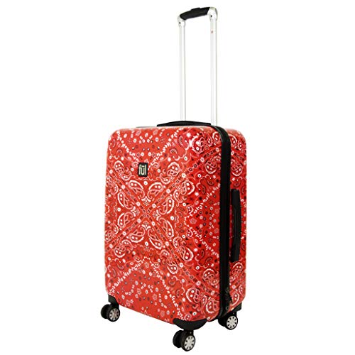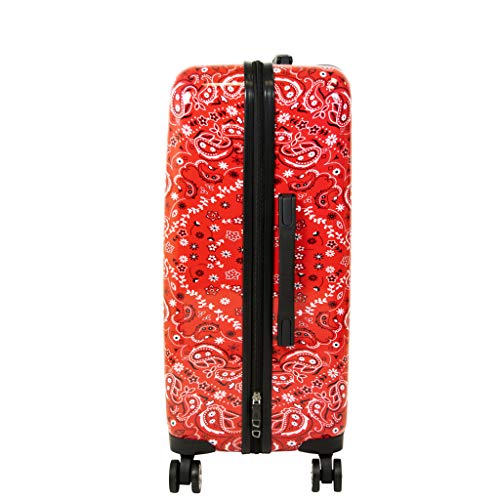 Details: The printed bandana 25in hard sided rolling luggage boasts a colorful, joyful print that will be the talk of the baggage claim. It is made with durable ABS plastic with a festive bandana print on the front. The luggage is mobile on multi-directional spinner wheels for smooth movement with an aluminum telescopic handle for steering. The polyester lined main compartment is divided for hassle-free organization. It also includes an interior zip mesh pocket for storing small travel items And clothing tie straps to help prevent spills. Finally, it includes retractable top and side carry handles for loading into trunks, cars, and overhead bins. The luggage is easy to spot clean and is backed with a 5 year warranty.