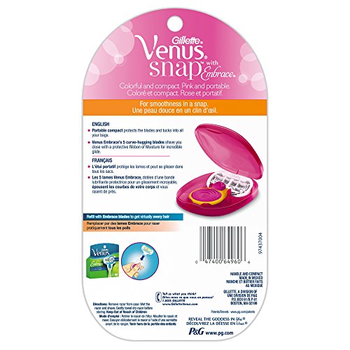Details: Experience instant smoothness on-the-go with our Venus Snap with Embrace Razor. With 5 curve-hugging blades, a mini-handle, and a portable compact you’ll be ready for anything, anytime, anywhere.