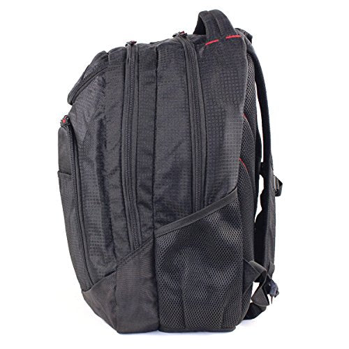 Details: Large polyester double compartment computer backpack. Roomy front compartment to hold folders, files, and notebooks. Extra-large rear compartment includes padded computer pocket that will hold most laptops with up to a 17 inch screen and a slim padded iPad/tablet pocket. Front gusseted zipper pocket with organization panel and key fob. Front zippered pocket for accessories. Softly lined protective stash pocket to hold digital media or other valuables. Side mesh beverage/accessory holster. Ergonomic shoulder straps. Padded top handle. Size: 18 inch h x 13 inch w x 10 inch d