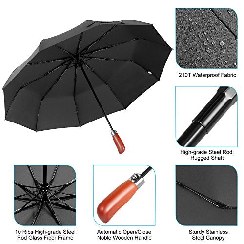 - ✅【Waterproof Fabric & Wooden Handle】Travel umbrella is made with 210T waterproof fabric which makes it waterproof and fast-drying. High density 210T umbrella surface can shake off rain as easily as a lotus leaf, and offer you the most thoughtful protection. The ergonomic wooden handle makes it comfortable to hold and easy to grip. We provide a perfect windproof travel/business umbrella for you.