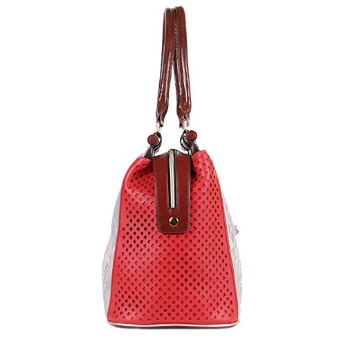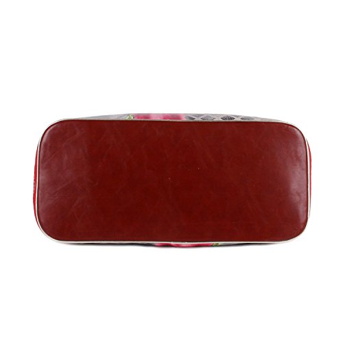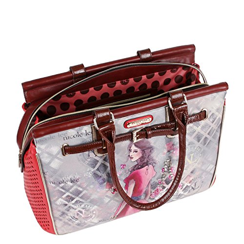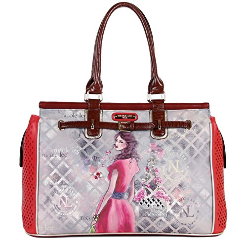 Details: Nicole lee daisy print overnighter is perfect for weekend getaway or for everyday trips. Exterior features: made of faux leather, Nicole lee's daisy print front and back, rhinestones embellishments, sequence details, studs, laser cut design on sides, faux croc handles, gold-tone hardware, front belt embellishment, dual top handles, 2 zipper closure, back zip pocket and Nicole lee nameplate in front. Interior features: zip wall pocket with no nameplate at interior back, double open wall pockets at interior front and polka dots print with no logo satin lining. Faux leather handles with 10 inch inch drop. Colors available are blue, red. For cleaning, wipe with damp cloth.