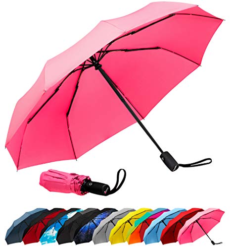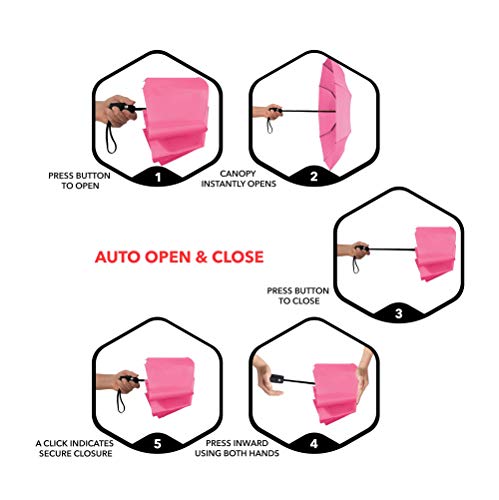 - AUTOMATIC, COMPACT, AND LIGHTWEIGHT - Auto open/close function allows for easy one-handed operation. Measuring just 11.5" long and weighing less than 1lb the folding handheld umbrella is extremely packable in purses, briefcases, backpacks, luggage and more.
