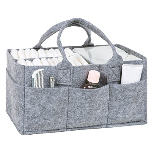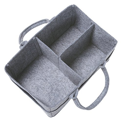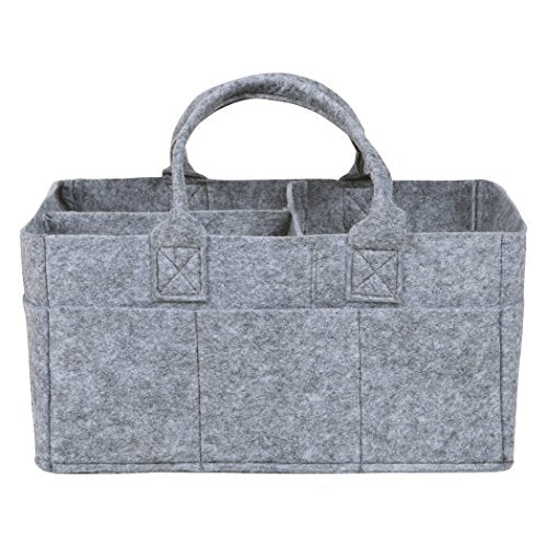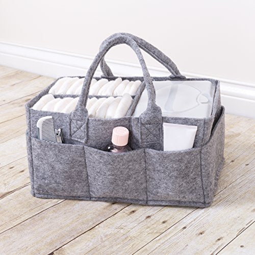 Details: Storage organizers available in a soft sturdy felt will become an everyday essential item for any new parent. Storage caddy is sectioned and designed to keep diapers, wipes and changing items organized. With sturdy felt handles, the storage can be easily moved from room to room. Can also be personalized. Keep clutter out of sight, or collapse the caddy when not in use. Felt Storage Caddy measures 12 in x 6 in x 8 in.