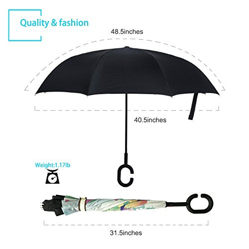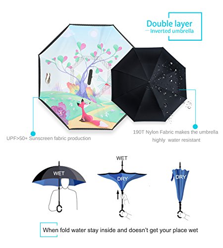 - IDEAL GIFT & 100% SATISFACTION GUARANTEE: The car inverted umbrella is perfect for your car and great for your parents, friends, colleagues as a gift. Using this upside down umbrella, you are always protected from rain, wind and UV. And we promise you will love our umbrella, or we'll return your money back in 24 hours while you keep the umbrella, this is our crazy promise and we mean it!