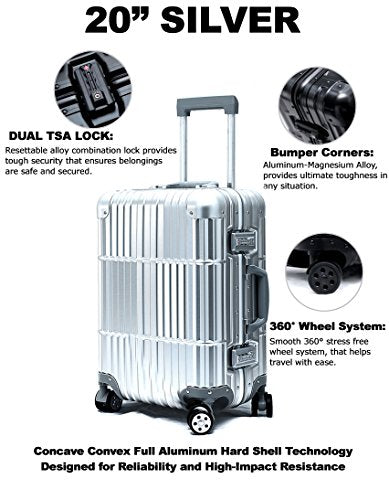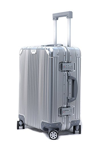 Details: Cloud 9 brings you a high quality carry on luggage/suitcase for all your travel needs, fits perfectly into the sizer at the airport. Made from 100% Aviation Grade 5 Aluminum-Magnesium Alloy. All Aluminum construction provides ultra durability and a light weight case for easy handling. 4 Dual-Blade Spinner Wheels for extra smooth and quiet 360° rolling. Also includes TSA Approved Dual Combo Locks, very easy to configure. Fully lined interior with multi-use organizational pockets make it easy for packing clothes.
