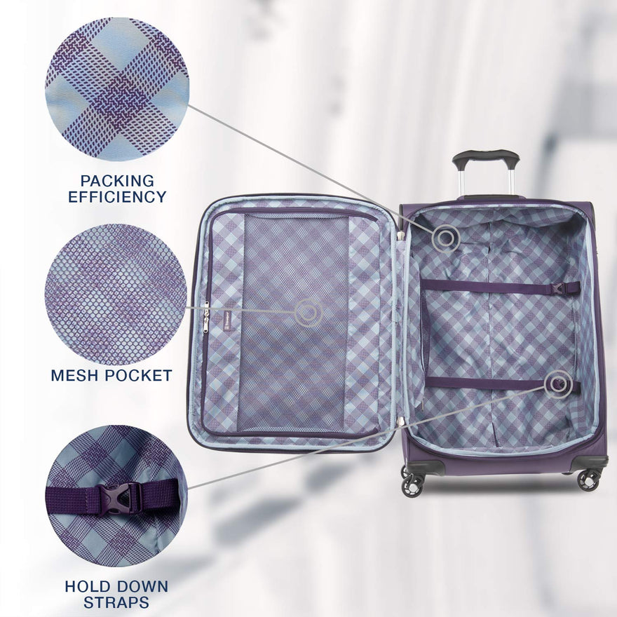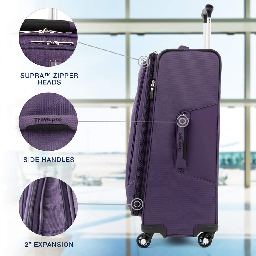 Details: Lighten up with the Maxlite 5 25 inch expandable spinner, The lighter-weight, ultra-durable, soft-sided spinner suitcase in a checked baggage size designed to accommodate medium–length and longer trips. Enjoy an easy, comfortable glide thanks to the 2-position adjustable PowerScope lite handle with patented Contour grip and 4-wheel 360 degree rotating spinners, and stay organized with a convenient front pocket, full-length interior lid pocket, side accessory pocket and roomy interior with adjustable hold-down straps. A high-tensile-strength expandable zipper maximizes packing space for impressive flexibility. Backed by a new and expanded trusted traveler promise—for worry-free coverage from Travelpro.