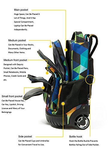 Do you have any reason that you don't buy it now? Weight? No! It can bear 30lb at least. So if kids think their bags is too heavy then can change to rolling it. If so,kids can carry their books and stationery easily. Maybe it is another way for kids to lighten the burden. It will be dirty? No! It is convenient to put the strap into the back mesh cushion if you want to wheeling it. Although you are in a rainy day, you just need pull-out the wheel cover from the zipper that top of the wheel, and cover the wheel, then you can avoid embarrassment .A clean bag will give you a nice felling and you will have a nice day. Color? No! Different colors in different pattern,you will find your favorite in them.