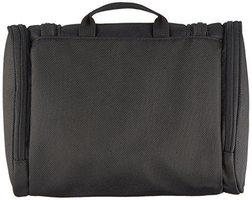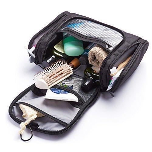 - Black toiletry bag designed with an internal lining to easily wipe down leaks and spills