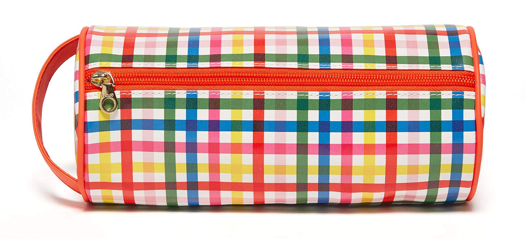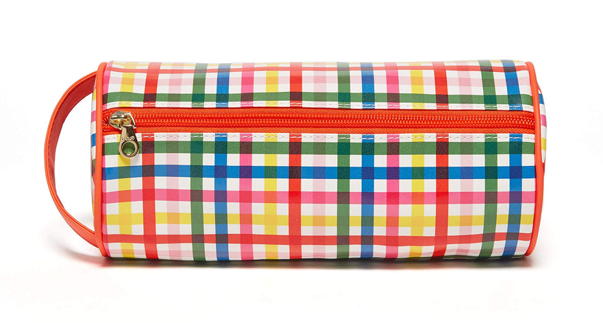 Details: The newest way to get it together in style. This update on our get it together pouch has a cylindrical shape, is perfect for writing utensils or makeup (and more!), and has a strap on the side for easy carrying. This cute pencil case measures 8.75 inches x 3.75 inches making it the perfect size pencil holder, cosmetic bags, or toiletry bag.