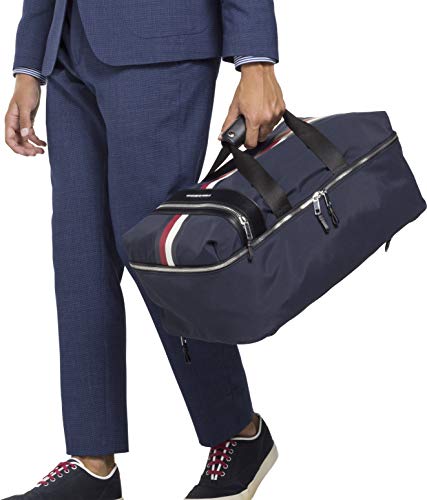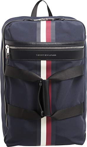 Details: This stylish weekend bag can be worn two ways - carried by hand or worn as a rucksack. Highlights Textile Signature tape on front Zip pocket for optional straps Double zip closure Detachable padded shoulder straps Hanging loop Two top straps with snap-close handle One front zipped compartment One interior zipped padded pocket Tommy Hilfiger branded zip pulls Tommy Hilfiger metal logo on front Shape & fit 28 x 10 x 3.5cm