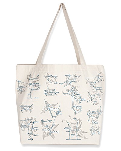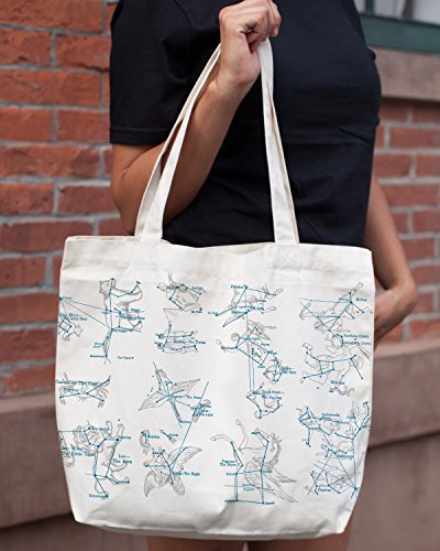 Details: This Constellations tote bag sports some of the famous groups of stars in our sky overlaid with drawings of the mythological characters we've seen within them. Gift one to your favorite astronomer, your star-gazing buddy, or anyone who loves to look up! Machine wash cold, gentle cycle. Tumble dry low, warm iron if needed. Made with 100% eco-friendly recycled cotton canvas. Width: 18" Height: 14.5" Gusset: 5" Shoulder Straps: 22" ---- NOTE: When you first open the bag you will notice an odor from the printing (non toxic). Simply hang the bag outside for about an hour, and the smell will dissipate. ---