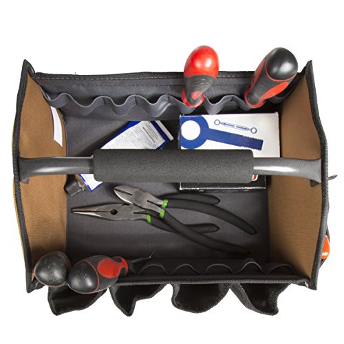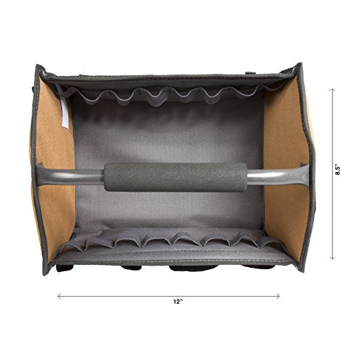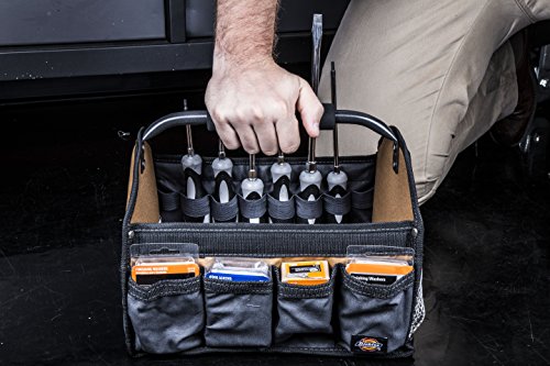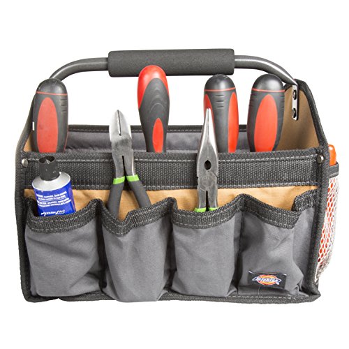 Details: With a solid upright structure and durable steel handle, the Dickies Work Gear 57035 Grey/Tan 12 in. Tote Bag is a must for on-the-job productivity. Constructed of sturdy canvas, it features a large open main compartment for easy access to all of your tools. On the interior, there are 16 elastic tool loops inside, which are perfect for screwdrivers and other small hand tools. On the exterior of the bag there are 4 webbing-reinforced pouch pockets, 2 hook and loop fastener straps to hold longer items securely in place, 2 mesh pockets, and 6 small tool slip pockets, letting you carry lighter gear and odd-shaped items with ease. The foam grip is a pleasant addition after a day spent working with your hands.