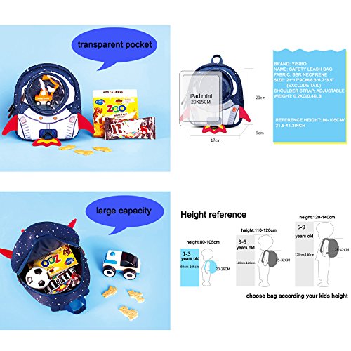 YISIBO Toddler Safety Harness Backpack Keep your child close by while on traving,walking,playing etc. This 3D rocket looking toddler backpack functions on its own with a roomy main compartment and transparent front pocket, but can also quickly convert to a harness by attaching the removable tether.