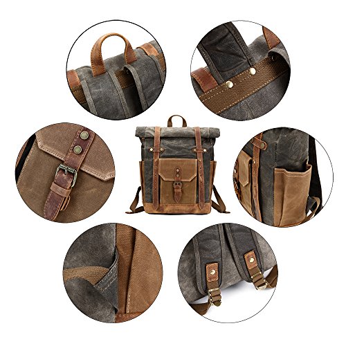 • ♔1.MATERIAL: The backpack Made with water-resistant waxed canvas fabric (waterproof canvas is a bit stiff and wrinkled initially )and genuine cowhide leather.(leather surface have disorderly wrinkles, scars, scratches that present the style of retro and wildness),This canvas rucksack has fashionable and vintage appearance to be an ideal travel backpack,13,14,15.6 laptop backpack,commuting backpack,Hiking Rucksack.