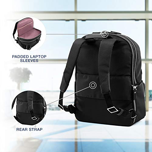 Details: The Maxlite 5 women's backpack from Travelpro is designed specifically for the modern woman in a slimmer profile than our laptop backpack. Convenient features built-in to this lightweight, ultra-durable backpack include a padded laptop or tablet sleeve, organizational pockets for power cords, back-up batteries, office supplies and more, a quick-access front pocket with magnetic closure ideal for cell phone or key storage and an exterior side pocket that fits a water bottle or compact umbrella with ease. Wear this bag with comfort using the padded shoulder straps or use the unobtrusive rear strap to Stack this bag on top of a spinner or Rollaboard suitcase for hands-free mobility.