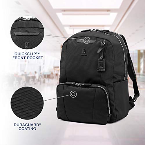 Details: The Maxlite 5 women's backpack from Travelpro is designed specifically for the modern woman in a slimmer profile than our laptop backpack. Convenient features built-in to this lightweight, ultra-durable backpack include a padded laptop or tablet sleeve, organizational pockets for power cords, back-up batteries, office supplies and more, a quick-access front pocket with magnetic closure ideal for cell phone or key storage and an exterior side pocket that fits a water bottle or compact umbrella with ease. Wear this bag with comfort using the padded shoulder straps or use the unobtrusive rear strap to Stack this bag on top of a spinner or Rollaboard suitcase for hands-free mobility.