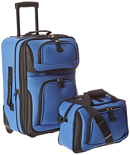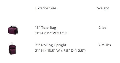 Details: Go anywhere with the Traveler's Choice U.S. Traveler Rio Two Piece Expandable Carry-On Luggage Se. This luggage set is made of luxurious superior 1200D rigid polyester construction. It features an interior deluxe retractable push-button/ self-locking handle system and inline skate wheels with corner protectors. It has all the space you need to pack your travel essentials including multiple front pockets and a large zippered mesh lid pocket. Need more room? The expandable feature provides 25% more packing capacity. Plus, it features full interior lining and dual adjustable tie down straps to secure your belongings. The solid metal hardware protects your things and the EVA padded front panel is designed to provide extra durability. Plus, the top and side carry handles make lifting luggage easy. Dimensions: 21-inch Upright: 21 in. H x 13.5 in. W x 7.5 in. D (Expands to 10.5 in. D); 6.6 lbs; Travel Tote: 14 in. W x 10 in. H x 6 in. D; 1.3 lbs.