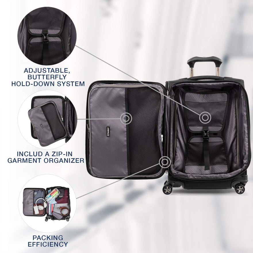 Details: Pack to the max with luggage that is truly all your own. The max carry-on expandable spinner is designed for total packing versatility and customizable with a variety of interchangeable Travelpro exclusive zip-in organizers. Included inside the lid is a removable zip-in garment organizer, ideal for storing folded shirts, dresses and jackets. Also available for purchase separately are four additional coordinating Travelpro exclusive zip-in organizers-a laundry organizer for bathing suits, workout clothes and other damp items, A packing cubes organizer for shorts, shirts and accessories, A suitor organizer to keep hanging clothes wrinkle-free and an all-in-one organizer for wet and dry storage (each sold separately). created for domestic travel on larger aircraft, this bag is sized to max out the sizer bin and fit In the overhead bins of most major yours. Airlines. It also features a tip-resistant zippered expansion to increase packing space up to two inches, but be careful not to overpack the exterior pockets and risk making it too big for the sizer bin. Enjoy total convenience with a built-in USB port and dedicated exterior power bank pocket, exterior padded laptop pocket and removable TSA-compliant toiletries bag that stores perfectly in a same-sized exterior pocket. Plus, this spinner's precision glide system ensures precise control and effortless roll on eight ultra-durable, 360 degree magnatrac spinner wheels led by a four-stop, height-adjustable PowerScope handle with comfortable Contour grip. Built for professional-grade dependability With robust corner armor, skid guards and heavy-duty wheel housings, crew versapack is the civilian version of the luggage flight crews use, tested to meet the same superior quality and durability standards. This spinner is further backed by the comprehensive built for a lifetime limited warranty with our trusted companion promise.