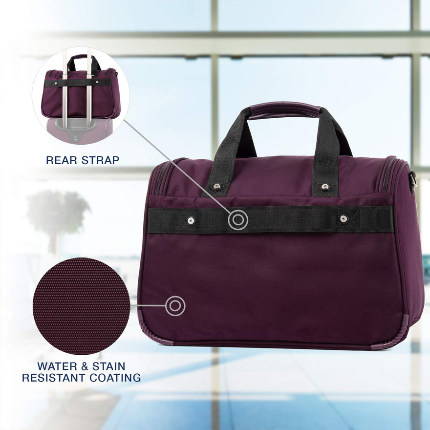 - Removable, adjustable shoulder strap offers hands-free carrying. Rear strap fits around the extension handle of a Rollaboard or spinner suitcase for secure stacking and hands-free mobility
