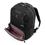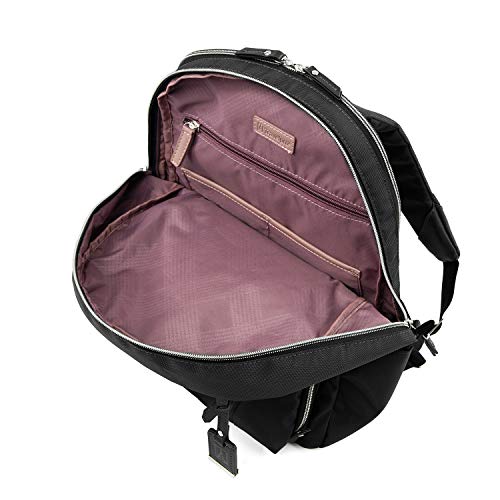 Details: The Maxlite 5 women's backpack from Travelpro is designed specifically for the modern woman in a slimmer profile than our laptop backpack. Convenient features built-in to this lightweight, ultra-durable backpack include a padded laptop or tablet sleeve, organizational pockets for power cords, back-up batteries, office supplies and more, a quick-access front pocket with magnetic closure ideal for cell phone or key storage and an exterior side pocket that fits a water bottle or compact umbrella with ease. Wear this bag with comfort using the padded shoulder straps or use the unobtrusive rear strap to Stack this bag on top of a spinner or Rollaboard suitcase for hands-free mobility.