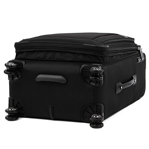 Details: Finally, great looking checked luggage that is as functional and durable as it is stylish. The Platinum Elite 25" Expandable Spinner is perfect for medium and long trips, accommodating everything you need, guarding against wrinkles with a built-in suiter and keeping everything organized under a deluxe tie-down system with integrated accessory pockets. Constructed with premium fabrics, leather accents and chrome zippers, this gorgeous bag also features a tip-resistant tapered expansion option that provides up to 2" additional packing capacity. Integrated lock allows TSA authorities to safely unlock and lock suitcase for inspection when needed (default lock code is 0-0-0 to open). For effortless mobility, this 25" suitcase is equipped with our Precision Glide system-eight MagnaTrac, self-aligning, 360-degree spinner wheels guided by an adjustable PowerScope extension handle with patented Contour Grip and rubberized touch points, ergonomically designed to be easy on the hands. Backed by Travelpro built for a lifetime limited warranty with our trusted companion promise which covers the cost of repair for damage from airline or other common carrier for 1 year.