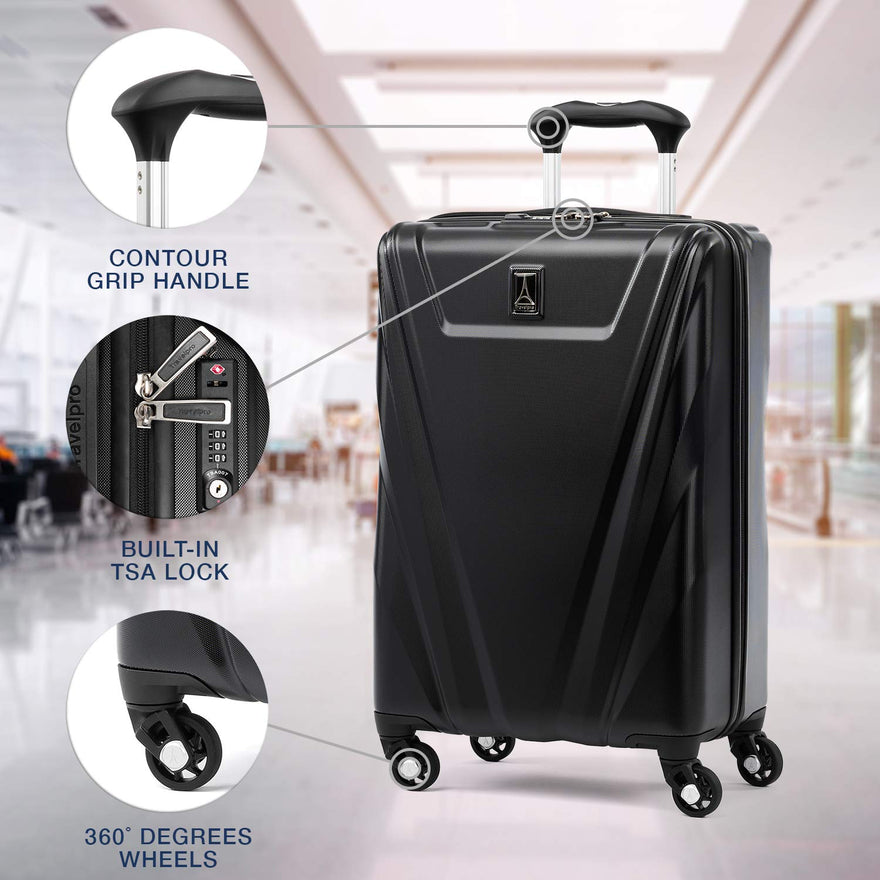 Details: Lightweight, slim and durable, the Maxlite 5 carry-on hardside spinner is designed to meet carry-on size restrictions for most domestic airlines. The ultra-lightweight polycarbonate shell provides ultimate durability, absorbing impact with flex to protect contents and resist cracking. Plus, the shell's textured surface helps reduce visible scratching or scuff marks, while molded corner guards serve as built-in bumpers on high-wear points. The integrated lock allows TSA authorities to safely unlock and lock suitcase for inspection when needed (default lock code is 0-0-0 to open). Great for shorter trips, this bag's split case construction and interior divider panel provide separate packing compartments, and elastic hold-down straps keep everything in its place. Roll through airports and city streets with ease on four 360 degree spinner wheels guided by the lightweight, height-adjustable PowerScope lite handle with comfortable Contour grip. Backed by Travelpro built for a lifetime limited warranty with our trusted companion promise which covers the cost of repair for damage from airline or other common carrier for 1 year.
